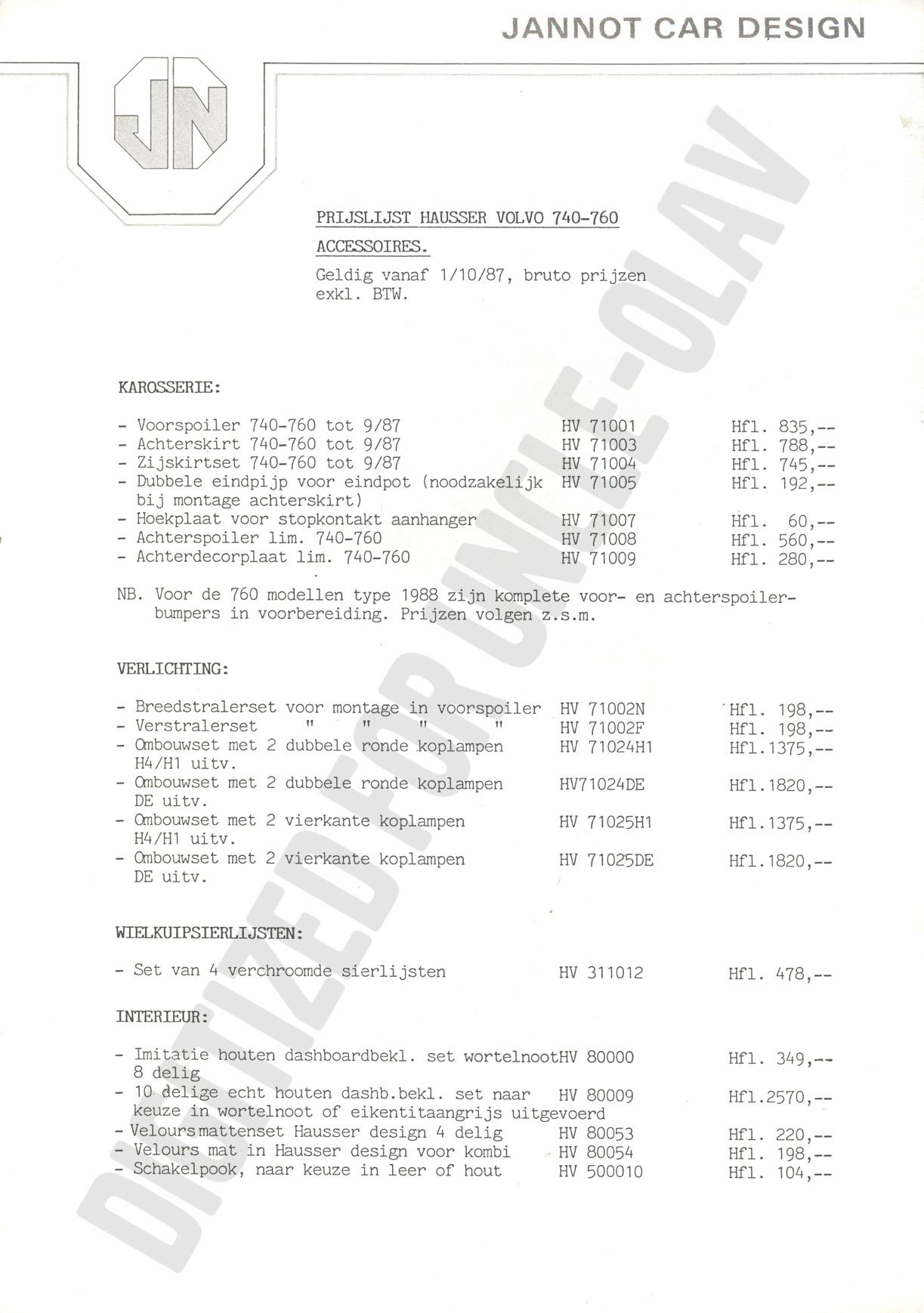 Pricelist Hausser Volvo 740-760 Accessoires - 1987 [no code, Dutch]