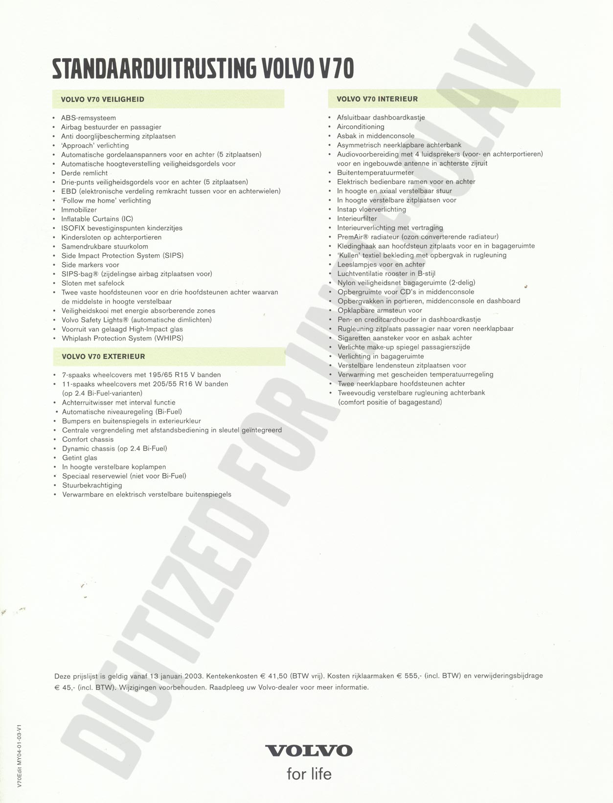 PRIJSLIJST VOLVO V70 EDITIONS - 13-01-2003 [ V70Edit MY04-01-03-V1, Dutch - NL]